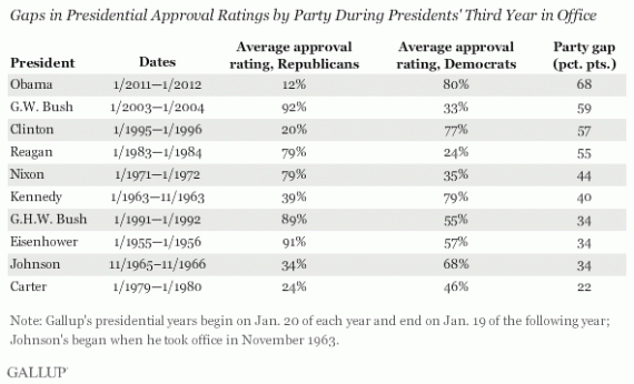 In fact, Obama’s Year Three average 68-percentage-point partisan gap is tied for the fourth highest in Gallup records dating back to the Eisenhower administration. Only George W. Bush’s fourth, fifth, and sixth years in office showed higher degrees of political polarization. Together, Bush and Obama account for the 7 most polarized years, and 8 of the top 10.