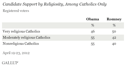 Second, the germane issue is not the breakdown of Catholic support by levels of religiosity. The key issue is whether the level of support among Catholics has changed since the contraception coverage controversy erupted. Obama in 2008 received 54% of the Catholic vote. Is his overall level of support among Catholics today less or more? Is that level of overall support less or more since the coverage controversy became front-page news?