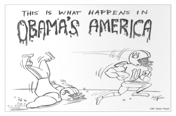 The Alabama player is tripped up as the Auburn player runs to victory under the words “This is what happens in Obama’s America.”