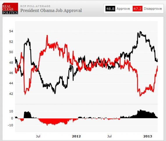 All of this makes me wonder if the President’s job approval numbers really matter anymore. Barack Obama is never again going to be standing for national election, after all, so it’s not like we’re looking at these numbers as some kind of guide of what will be happening in 2016. To some extent, I suppose, the President’s job approval could have an impact on voter sentiment in 2014, but those elections are more likely to be influenced by the state of the economy along with whatever issues end up playing a prominent role 20 months from now. It strikes me that it would be far more important to look at where the public stands on the President’s various agenda items than on his job approval because, in the end, that number simply doesn’t mean as much as it did for the first four years of his Presidency.