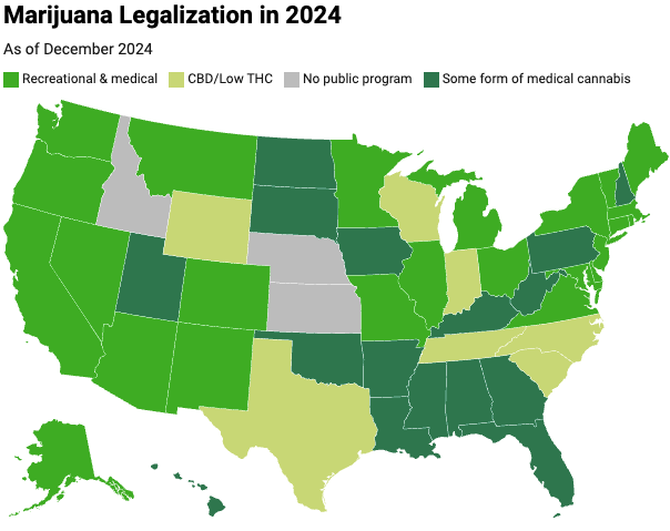 According to a recent analysis by the National Conference of State Legislatures, only Idaho, Nebraska, and Kansas have no allowance for legal use of marijuana at all. In most of the country, recreational use is legal. An pretty much everywhere else allows medical use: