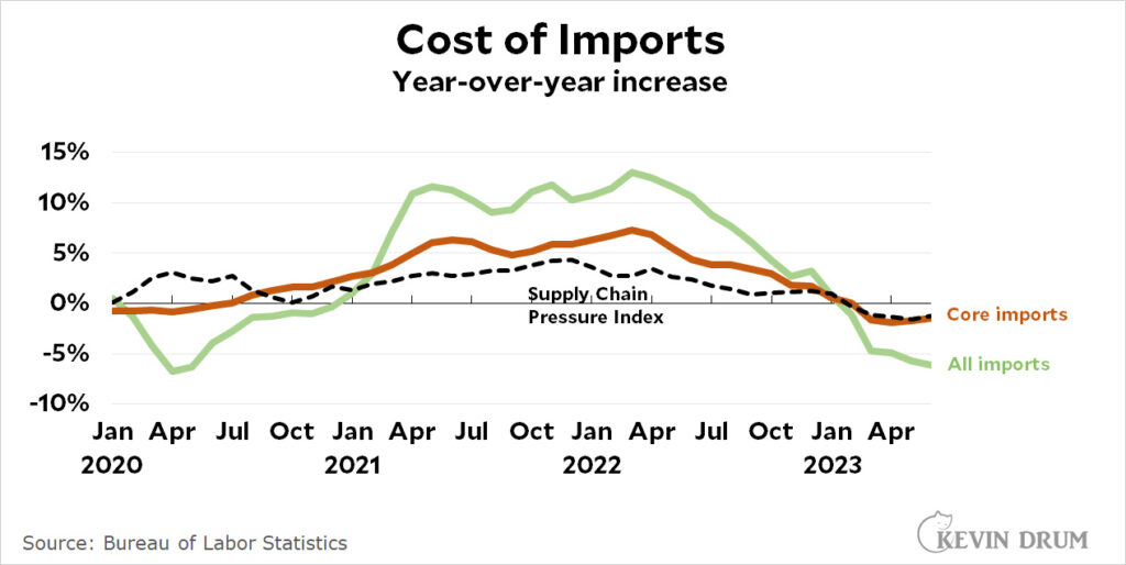 Kevin Drum had back-to-back posts on inflation yesterday. The most recent, “Imports are getting cheaper and cheaper,” is supported by this graph:
