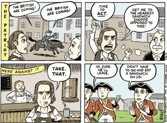 Well, the silent roar that happened last week was more akin to the resistance to the Stamp Act and the Townsend Acts in the late 1760s than the events of 1776 or even 1773. Should these politicians who would be king try to send their troops against the People, I doubt a sandwich will be the weapon of choice for the freedom fiighters. But then politicians sometimes need the message spelled out for them.