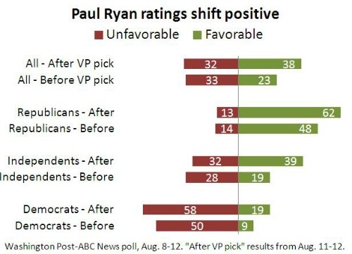 UPDATE: Moments after hitting Publish on the above, I see Jim Geraghty‘s link to Jon Cohen’s posting at WaPo (“Positive views of Ryan jump higher after pick“) showing Ryan’s inevitable post-announcement bump: