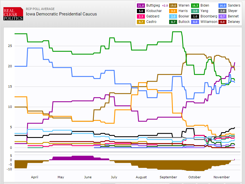 You can also see Buttigieg’s rise in the RealClearPolitics average, where Buttigieg is represented by the purple line: