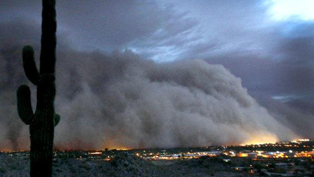 Towering over skyscrapers and grounding flights, the wall of dust swept across the desert from the south at around nightfall, blanketing downtown Phoenix.