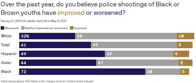 Nearly seven out of 10 Black Americans say police treatment has gotten worse in the past year, and about the same percentage believe police shootings of Black and brown youths have become worse in that time, according to an Axios-Ipsos poll.