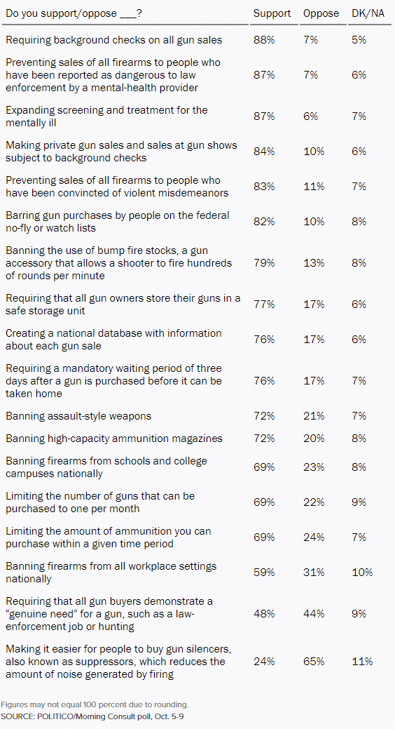 A new POLITICO/Morning Consult poll shows that a majority of voters support stricter gun control laws in the wake of last week’s mass murder of 58 concertgoers in Las Vegas by a single man with nearly two dozen firearms shooting from the window of his 32nd-floor hotel room.