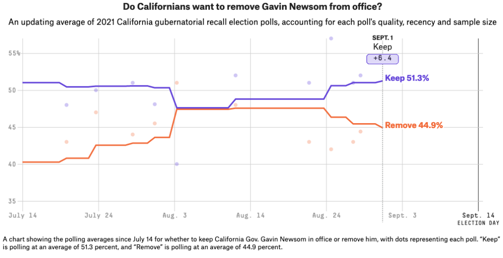 Going by the average, it is pretty close, but it is also worth pointing out that more recent polls are more favorable to keeping Newsom and much of the angst being felt by California Democrats is fueled by polling from some weeks back.