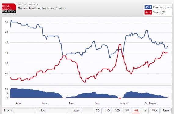 With forty-nine days, just seven weeks, left to go in the race for President, the race has largely continued in the holding pattern that I mentioned last week while the polls continue to tighten as we get closer to the first debate next Monday night. On the news front, the campaign was largely dominated by news about the candidate’s health that was prompted by an apparent fainting spell on Clinton’s part while she was at the memorial service for the victims of the September 11th attacks in New York City. We later learned that Clinton had been diagnosed with pneumonia the previous Friday, a diagnosis which explained much about Clinton’s apparent condition over the previous weeks, including multiple episodes in which she appeared to be unable to shake a cough while speaking. While the press criticized the Clinton campaign for failing to disclose the Friday diagnosis earlier, the diagnosis resulted in Clinton taking several days off the campaign trail, not returning for events until Thursday, at which point she seemed to be in noticeably better condition and far more energetic than she had been leading up to the incident that prompted her to take time off the trail. The incident also led both Clinton and Trump to release additional health records, although in both cases physicians and others said that the information being released still wasn’t detailed enough. The other big news of the week came about when Donald Trump was asked yet again about his previous advocacy for allegations that President Obama was not a legitimate President because he was not born in the United States, an allegation he rode to the new heights of popularity in 2011 but which he’s largely avoided this time around. After being asked about it yet again, Trump came out late in the week and said that he now believed that the President was born in the U.S., but also advanced the largely false claim (see here, here, here, and here) that the birther story began with the Clinton campaign in 2008. As the week came to a close, apparent terror attacks in New York City and New Jersey seemed certain to set the stage for the final week of campaigning before the first debate, In any event, there were hardly any major developments in the race news-wise and both campaigns seemed to spend the week shoring up their own supporters rather than reaching out to new ones