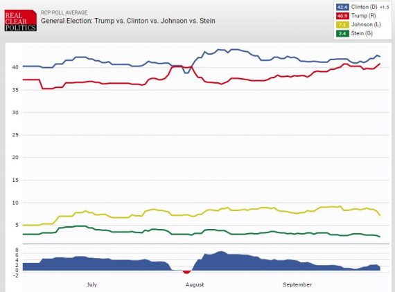 Taking one last look at the polls prior to the debate, we see that very little has changed although there are some signs that Hillary Clinton has started to turn around the dip in the polls that began roughly five weeks ago. So far this has shown up mostly in a handful of national polls that continue to show Clinton in the lead while only the Los Angeles Times tracking poll, which continues to be the only poll to show Trump in the lead. In the RealClearPolitics head-to-head poll, for example, Clinton (45 7 %) has a 2.3 point lead over Trump (43.4%), which is actually an improvement over last week when her lead was down to 1.3 points. In a four way race, Clinton stands at 42.4% while Trump stands at 40.9%. giving her a 1.5 point average lead, which again is an improvement over last week but well below where the race stood five weeks ago. In that four-way race, Libertarian Party nominee Gary Johnson stands at 7.1% and Green Party nominee Jill Stein stands at 2.4%. The Pollster average shows a slightly larger lead for Clinton in both a two-way race and a three-way race that includes Johnson,