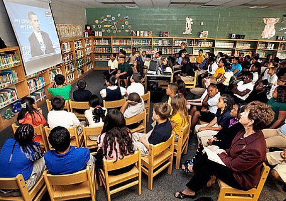 Fourth grade students at Amqui Elementary School in Nashville, Tenn., watch the broadcast of President Barack Obama delivering a speech on the importance of education on Tuesday, Sept. 8, 2009. (AP Photo/Mark Humphrey)