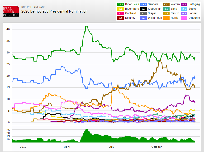 The fourth debate in October consisted of much of the same clash between the party’s progressive’s and moderates that we’ve seen before but didn’t really result in any significant changes in the polls as Biden and Warren continued as the top two candidates, followed by Sanders and Buttigieg, with Harris fading but still hanging on in most national and state polling.