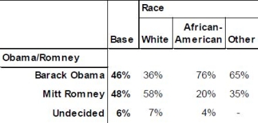 @Racehorse: Inside the bubble is no place in which to reside. FYI, the chances of Obama receiving less than 10% of the black vote in any state are about the same as Romney’s chances of being named leader of the Southern Baptist Church.