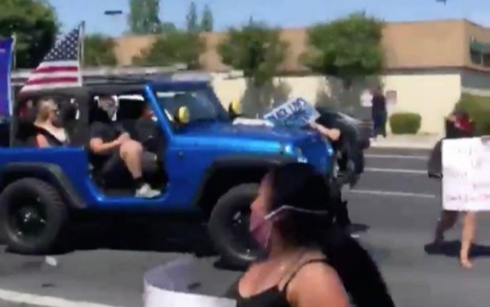 Around the same time in Visalia, California, occupants of a Jeep displaying a “Keep America Great” flag hit two protesters who were in the road, causing minor injuries, according to Visalia police. Witnesses said those inside the car were mocking protesters by cupping their ears as if they couldn’t hear their chants. The protesters started chanting profanities and throwing items before they approached the Jeep, which then accelerated, hitting the protesters before driving off.
