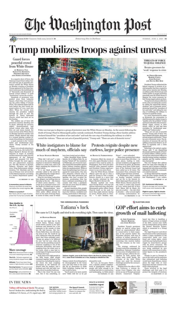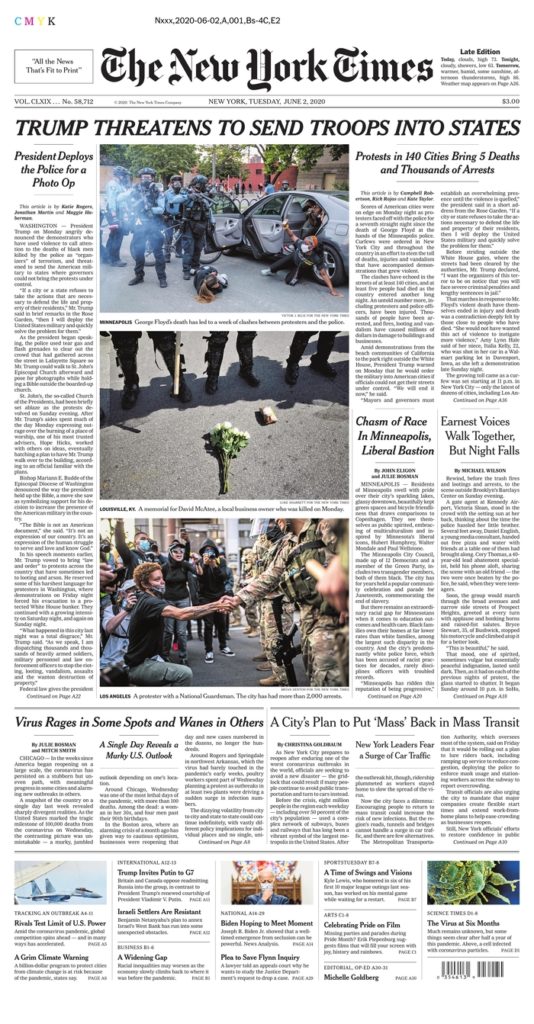 The President of the United States’ outrageous response to protests against police violence has finally become sufficiently extreme to get top billing on the front pages of our top newspapers.