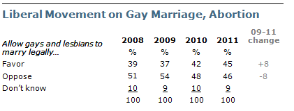 When you look at that graph, the shift is dramatic; in 1988, just 22 years ago, only 12% of Americans supported gay marriage. In 2010, it was 46%, with only 40% opposed. And it’s even a big shift from 2008 to 2010: support went up seven points, and opposition trended downward seven points.