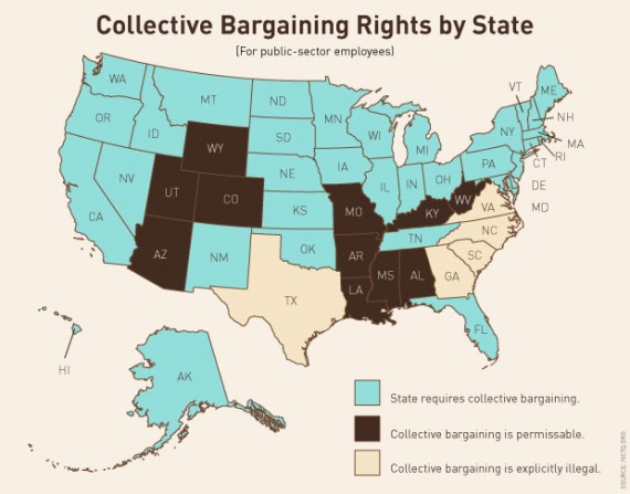 Josh Marshall provides this handy dandy map of Collective Bargaining Rights by State: