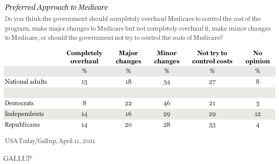 Gallup also polled respondents on what they would support to address the budget problems in the future, a subject that President Obama will address later today. Those results are predictable, although not very helpful in reaching a long term solution to our problem. For example, 59% of respondents support raising taxes on those earning $250,000/year or more, 37% oppose such tax cuts. Additionally, respondents were essentially equally divided on cuts to domestic spending, but the partisan divide there is rather stark: