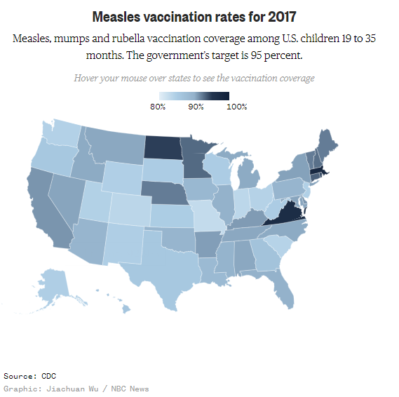 While this anti-vaccination movement seems like something that would take hold among lower-income, less-educated people, the reality has been quite different. Public health authorities in some of the wealthiest and best-educated counties and cities in the United States have reported that vaccination rates in their jurisdictions are actually worse than in less-educated and poorer parts of the country. Additionally, the anti-vaccination crowd, which continues to exist notwithstanding the fact that it has been utterly repudiated by science, has also targeted immigrant groups in Minnesota and elsewhere in the country, bombarding them with anti-vaccination propaganda at a rate that is difficult for public officials to keep up with. The prospect, then, of the problems Europe is now facing coming to American shores cannot easily be dismissed, something that can easily be seen in this chart showing vaccination rates across the country: