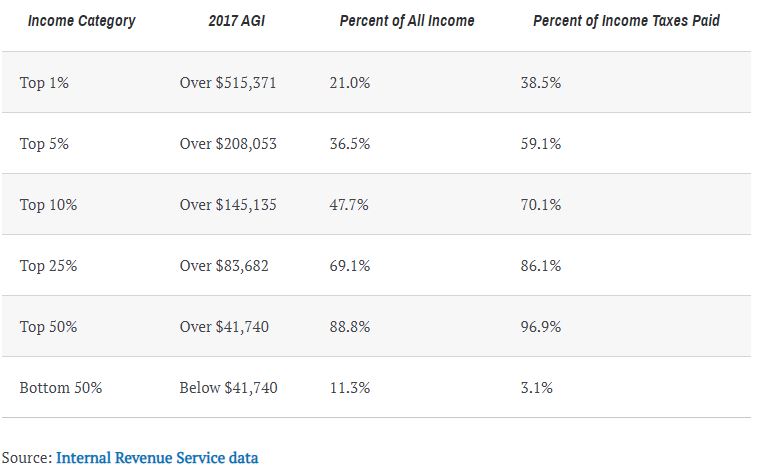 *In 2017, the top 50 percent of all taxpayers paid 97 percent of all individual income taxes, while the bottom 50 percent paid the remaining 3 percent.