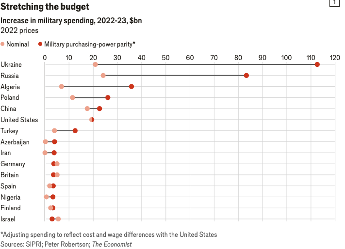 The adjustments show that Ukraine’s budget increases (though not its total budget) will stretch further than Russia’s, for example, even though its budget grew at a slightly slower rate in nominal terms (see chart 1). And money spent by America’s allies in NATO will matter much more than the dollar figures suggest. Their annual spending in 2023 was just 47.3% of America’s, but adjusted for their lower costs it was 78.5%.