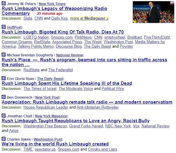 I think that’s a fair characterization of Limbaugh’s legacy. But that’s opinion, not news. And goodness knows, there’s plenty of space—including at places like the New York Times and Washington Post—for commentators to express their opinions of Limbaugh. Indeed: