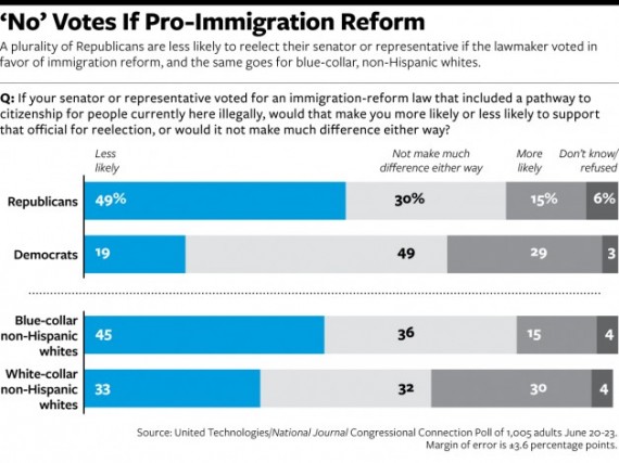A sizable plurality of registered GOP voters say they will be less likely to support their incumbent lawmaker if he or she votes for immigration reform that includes a pathway to citizenship for those currently living illegally in the United States, according to the latest United Technologies/National Journal Congressional Connection Poll. The findings show that even as national Republican leaders tout the Senate’s reform measure as a political necessity for the party, it remains a risky vote for individual GOP lawmakers wary of a primary challenger.