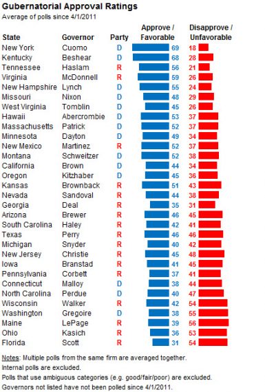 Nate Silver does some correlation plots of governor ideology versus constituent ideology. Given the admitted crudeness of the methodology, I’m not sure the results are especially useful. His chart of approval ratings, however, is pretty straightforward: