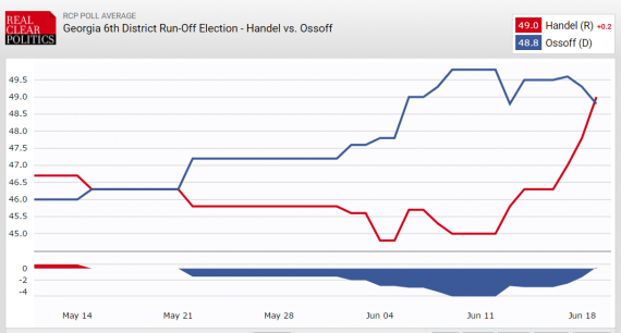 While all of this may prove insightful at some point down the road, the fact of the matter is that a Republican won in a district that has gone Republican since Newt Gingrich won the seat in 1978. While Ossoff did come close to winning the seat outright in the first round “jungle primary” in April, that was due in large part to the fact that there were ten other Republicans opposing Handel, four other Democrats opposing Ossoff, and two Independents on the ballot. As I noted at the time of that first round, the odds were against Ossoff winning the Special Election notwithstanding the fact he came within just a few points short of winning the 50% plus one of the votes that would have made a runoff election unnecessary. As the race for the runoff went on, the truth of how difficult it would be for Ossoff to win became more and more apparent. While he did lead in much of the polling after the first round, Handel began surging in the last several weeks to the point where she held a modest lead in the RealClearPolitics and Pollster polling averages. That should have been a signal to pundits, journalists, and the outside activists backing Ossoff that they odds were against them. You can see the reality that the polls were showing in spite of the national media spin, in the RealClearPolitics chart of the polling in this race: