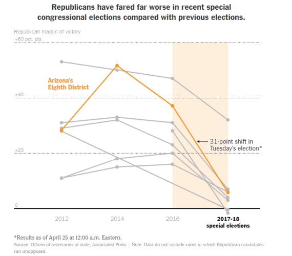 Given all of this, Lesko’s win is no surprise. What is a surprise, though, is the fact that Lesko only managed to win by less than ten percent in a district that is so heavily Republican. According to the current tally at Politico, Lesko leads her opponent by just over 9,000 and the margin of victory between the two is just 5.06%, far below what you’d expect from a Republican in a district like this, especially in a Special Election where the electoral is presumably smaller and more Republican-leaning than it would be in a General Election. This is worth noting because, as this chart from The New York Times shows, Republicans have lost support in every Special Election that’s taken place since Donald Trump took office: (click to enlarge)