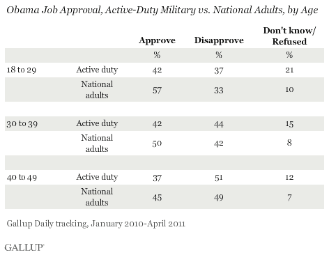 Interestingly, the Gallup survey also showed that “Although active-duty military personnel are less likely to approve of the job Obama is doing than are national adults overall, this group’s disapproval is only marginally higher than that of national adults. This is because active-duty military — particularly those under 40 — are significantly more likely to say they have no opinion about Obama’s job performance than is the case for all adults in the same age group.” That’s a healthy sign, actually: it means that deference to civilian authority is still a strong part of the military ethic, even down to the enlisted ranks.