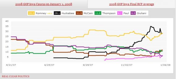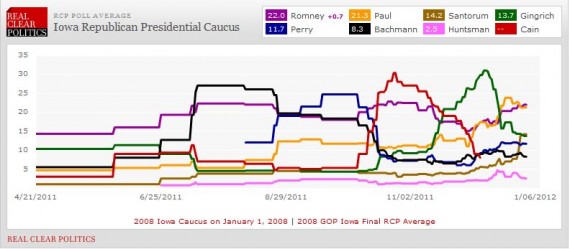 The end of the race chaos in the polling charts is leading many to conclude that anything could happen Tuesday night, and perhaps that’s true. However, it strikes me that we we already know how Iowa is going to turn out regardless of what the final order of finish is. Mitt Romney and Ron Paul are both going to come out of Iowa in fairly good shape. There’s still a potential for Paul to come out on top Tuesday night, mostly because of his highly motivated supporters, but even if he does it’s not going to matter very much because Paul himself doesn’t have much of a future outside Iowa and New Hampshire. Santorum looks likely to finish at least third now, which at least gives him an argument for going on to the next phase of the race, which for him should be to bypass New Hampshire entirely and head to South Carolina for the next two and a half weeks. Romney, however, is going to leave Iowa having effectively neutralized the real competition in this race, Newt Gingrich and Rick Perry. Neither Paul nor Santorum are going to be the Republican nominee, and it seems hard to see how Santorum in particular survives much past January unless he somehow manages to bring in a lot more money than he has so far. Heading into this, Romney has to like the field that presents itself to him.