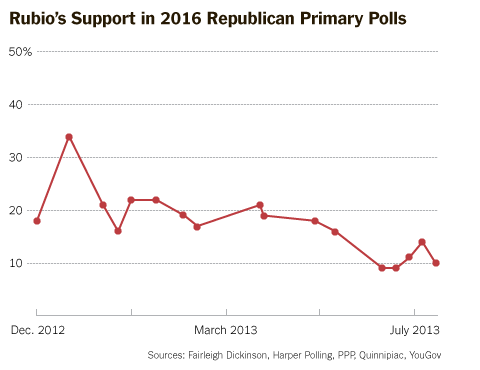 Only two surveys, one by ABC News and The Washington Post and one by Rasmussen Reports, have tested Mr. Rubio’s popularity since the Senate reached the final stages of passing a comprehensive immigration reform bill. Both measured double-digit drops in his net favorability rating among Republicans.