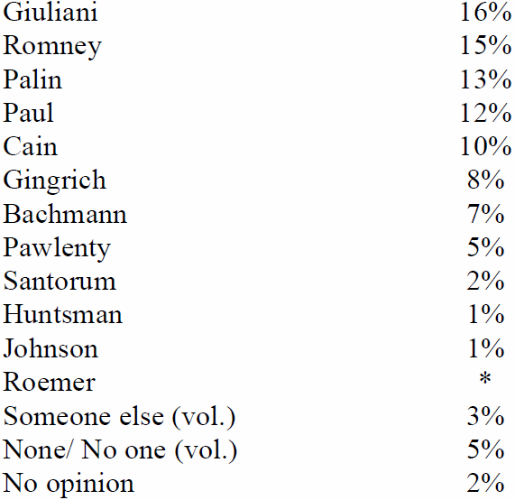 According to the poll, which was released Friday, 16 percent of Republicans and independents who lean towards the GOP say they would most likely support Rudy Giuliani as their party’s nominee. One point behind, at 15 percent is Mitt Romney, with Sarah Palin coming in at 13 percent.