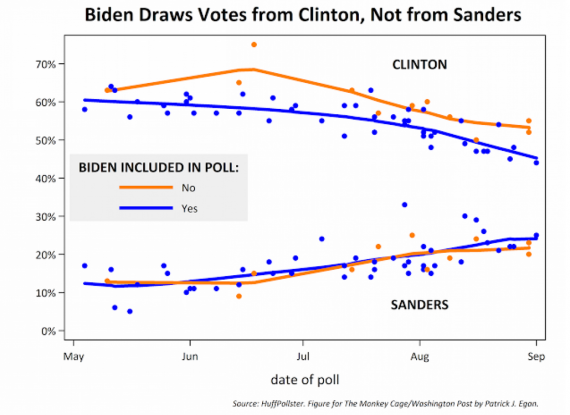 To the extent that Sanders is relying upon “anybody but Hillary” voters for his support, an entry by Biden — who would be a much better-known alternative to Clinton — could cause Sanders’s poll numbers to decline.