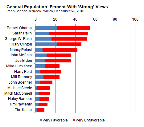 While it’s still very early in terms of the 2012 presidential cycle, giving Palin plenty of time to change people’s minds, she’s unusual among potential Obama challengers in not only name recognition but depth of public sentiment. As Nate Silver notes, “an unusually large number of Americans — and possibly a majority — have a strong view of Ms. Palin.”