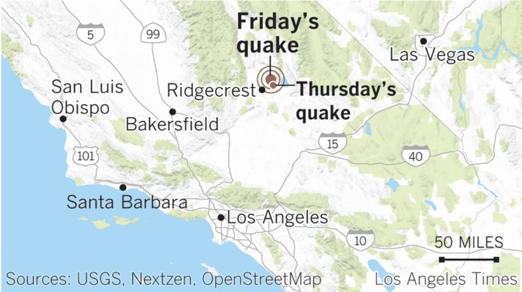 Friday night’s quake caused some fires and other damage in and around Ridgecrest and Trona, two Mojave Desert towns shaken by both quakes, said Mark Ghilarducci, director of the California Governor’s Office of Emergency Services. The quake was felt as far away as Phoenix, Las Vegas, Baja California and Reno, according to crowd-sourced data logged into the U.S. Geological Survey’s Did You Feel It? website.