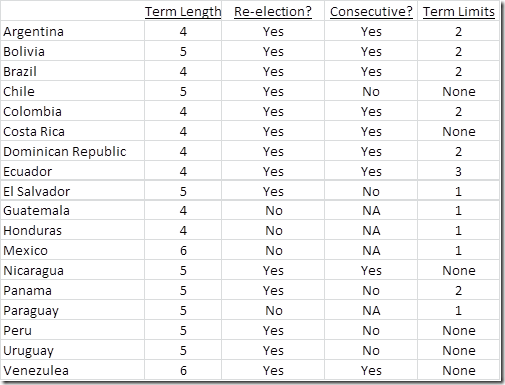 An interesting piece on this topic can be found at openDemocracy: Latin America: re-election and democracy.