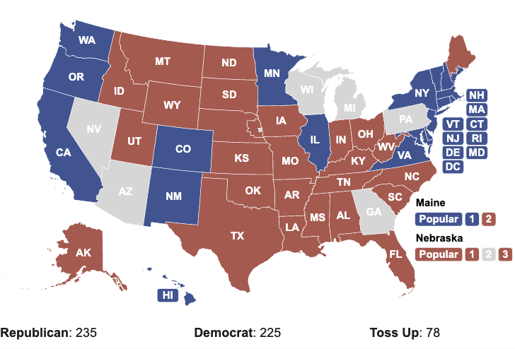Above is Taegan Goddard’s Electoral Vote Map, which is interactive at the link. Note that this interactivity is limited to only six states, as he considers the others non-competitive based on polling and past results.