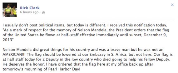 “I usually don’t post political items, but today is different. I received this notification today, ‘As a mark of respect for the memory of Nelson Mandela, the President orders that the flag of the United States be flown at half-staff effective immediately until sunset, December 9, 2013,'” Clark wrote. “Nelson Mandela did great things for his country and was a brave man but he was not an AMERICAN!!! The flag should be lowered at our Embassy in