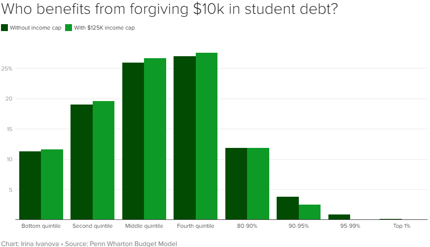 The benefit of erasing billions in college loans would mostly go toward Americans higher up the income ladder, the analysis also found. More than two-thirds of the debt forgiveness would help people in the top 60% of the income distribution — or those who earn $82,400 or more per year.