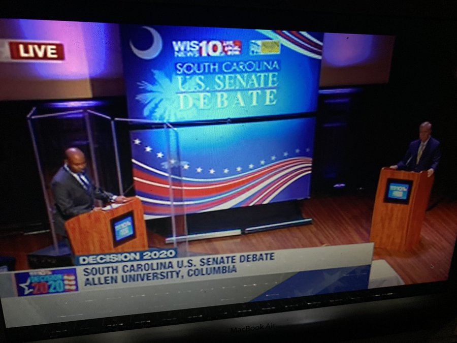 Jaime Harrison brings plexiglass shield to debate with Lindsey Graham.
