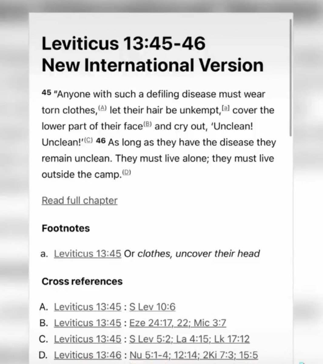 (Reading down the thread a bit farther, the above pertains to leprosy, which actually is an airborne disease. But, by analogy …).