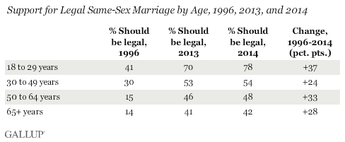 As other polls have shown, this poll also shows some differences based on the age of the respondents, with younger Americans far more supportive of marriage equality than older Americans: