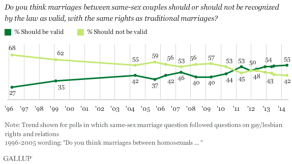WASHINGTON, D.C. — Americans’ support for the law recognizing same-sex marriages as legally valid has increased yet again, now at 55%. Marriage equality advocates have had a string of legal successes over the past year, most recently this week in Pennsylvania and Oregon where federal judges struck down bans on gay marriage.