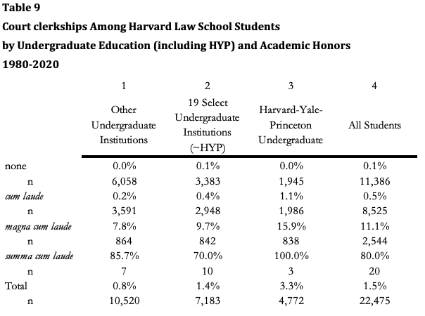 They were three times as likely to get clerkships as those who had gone to the other 19 undergraduate institutions when graduating with cum laude honors and 50 percent more likely when graduating with magna cum laude honors. Both differences were statistically significant. (Summa cum laude honors were very rare and very often led to clerkships regardless of undergraduate institution.)