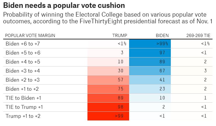 If Biden wins the popular vote by 2 to 3 percentage points, the Electoral College is roughly a toss-up. But if Biden wins the popular vote by less than 2 points, Trump is a fairly heavy favorite to win the election. Even popular vote margins of up to 6 points are not entirely safe for Biden if his votes are distributed in exactly the wrong way. So you can see why an 8- or 9-point lead in the popular vote shouldn’t make Biden feel that secure; despite being a landslide margin, it’s also only a few points removed from the inflection point where the Electoral College starts to become competitive.