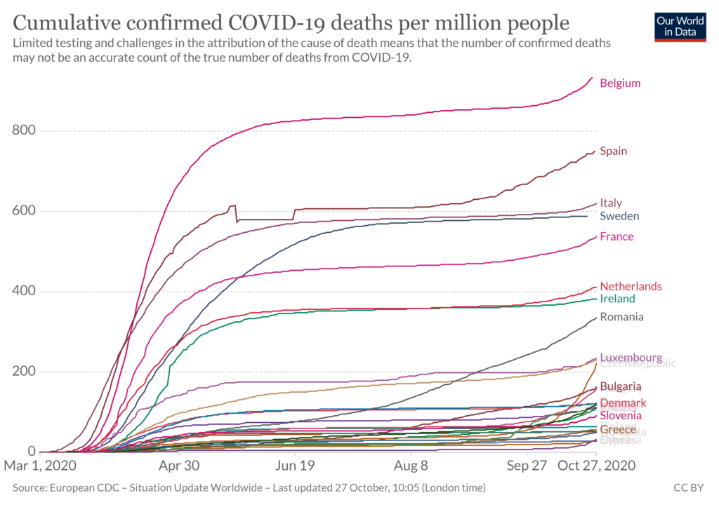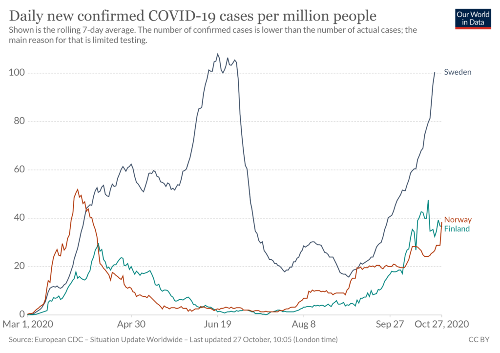 The “Daily confirmed covid-19 deaths per million” graph is the one that right wingers are pointing to, it seems to me. Things were harrowing for a while, but now the death rate in Sweden is about the same as in Finland or Norway.