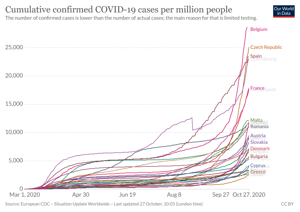 First, cumulative cases per million people: